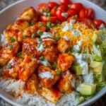 - Assemble Your Bowls: In serving bowls, add warm cooked rice as a base. Spoon the buffalo chicken mixture over the rice, top with lettuce, cherry tomatoes, cheddar cheese, ranch dressing, and garnish with green onions.