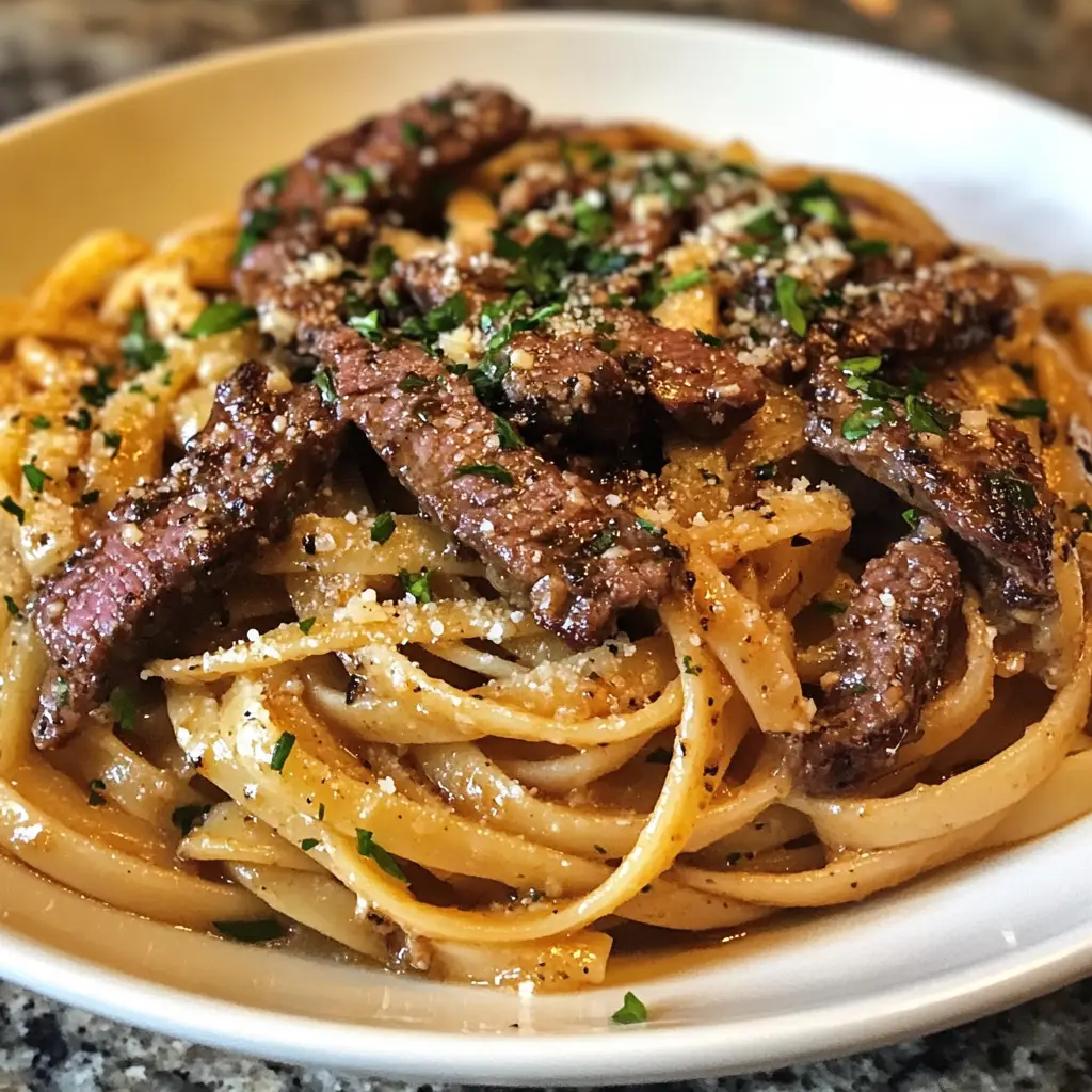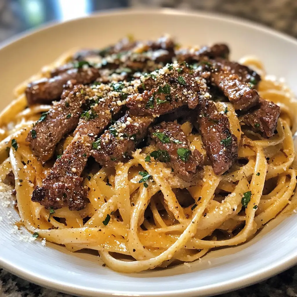 A delicious and flavorful dish combining Cajun spices, garlic butter, and tender beef strips served over linguine.