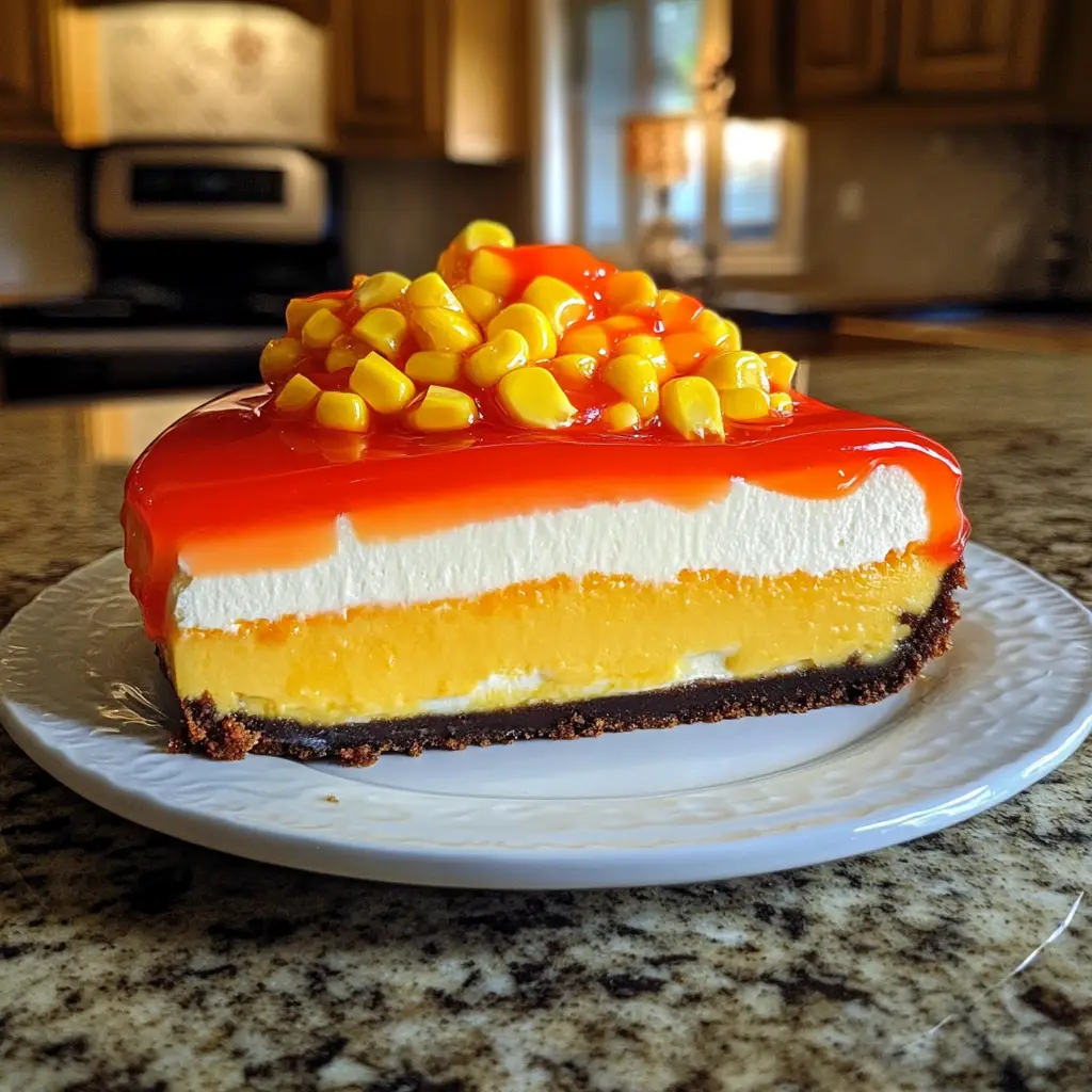 A delightful and festive cheesecake featuring layers of candy corn-inspired flavors, perfect for Halloween celebrations.