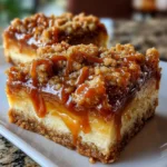Delicious caramel apple cheesecake bars topped with a crunchy streusel, perfect for dessert lovers.