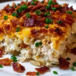 A comforting casserole filled with tender chicken, creamy ranch dressing, and crispy bacon, topped with gooey cheddar cheese.