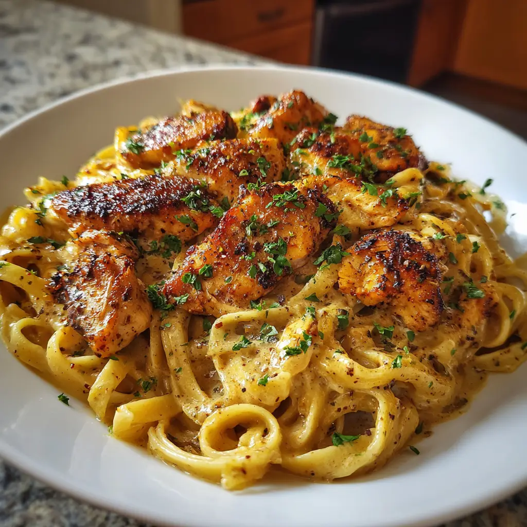 A delicious and creamy pasta dish featuring Cajun-seasoned chicken, garlic, and a rich butter sauce.