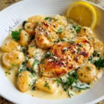Indulge in a comforting plate of creamy lemon Parmesan chicken gnocchi, where rich flavors harmonize beautifully.
