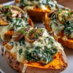 Deliciously creamy stuffed sweet potatoes filled with sautéed mushrooms, fresh spinach, and rich cheeses—perfect for chilly evenings.
