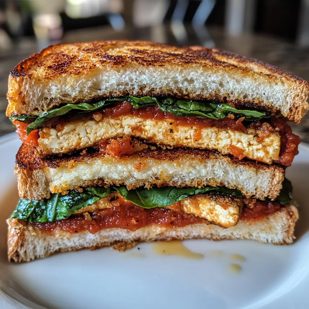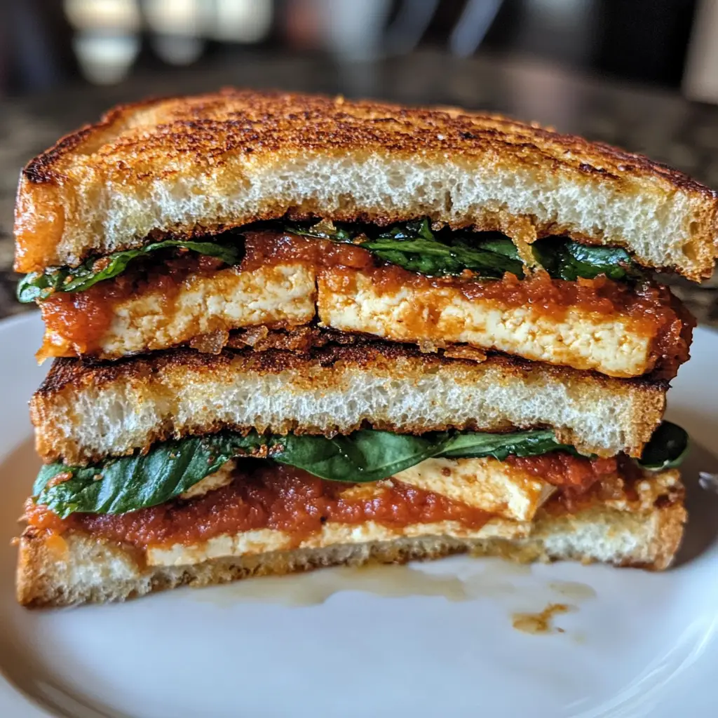 A delicious vegetarian sandwich featuring crispy tofu, marinara sauce, and melted cheese, perfect for a satisfying meal.