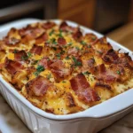 A delicious and hearty breakfast casserole featuring everything bagels, cheddar cheese, and crispy bacon, perfect for starting your day.