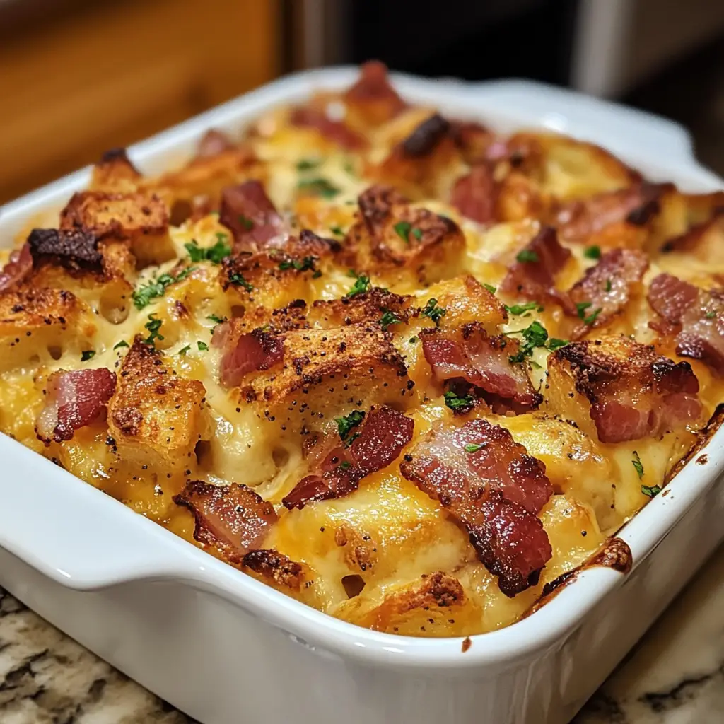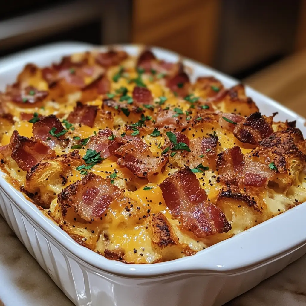 A delicious and hearty breakfast casserole featuring everything bagels, cheddar cheese, and crispy bacon, perfect for starting your day.