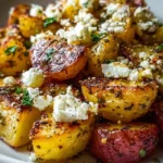The aroma of roasted potatoes fills the air, mingling with the rich, briny smell of crumbled feta, creating a tantalizing symphony that enchants the senses. Picture a golden-brown crust developed through the roasting process, exuding an enchanting crunch, while the inside remains soft and fluffy, bursting with flavor. Each bite delivers a chorus of textures—a perfect harmony of creamy feta, savory garlic, and the warm earthiness of potatoes, all beautifully infused with fragrant oregano. You can almost hear the comforting crackle of the potatoes as you dive in, each forkful promising yet another delightful exploration of taste.