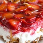 As you serve this vibrant dish, the aroma of strawberries fills the air, invoking sunny picnics and joyful gatherings. Each layer offers a different experience: the satisfying crunch of pretzels, the cloud-like creaminess of dairy-free cream cheese, and the burst of freshness from the strawberries. With every bite, you hear the satisfying crunch of the crust giving way to the velvety cream and fruity topping. This dessert isn’t just food; it’s an invitation to savor life’s sweetest moments.