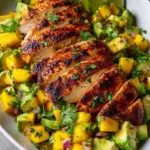 A refreshing grilled chicken dish topped with a vibrant mango and avocado mix, perfect for summer barbecues or family dinners.