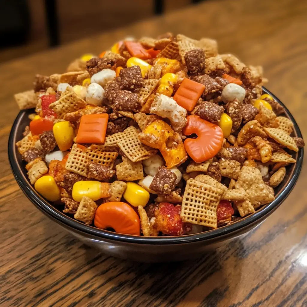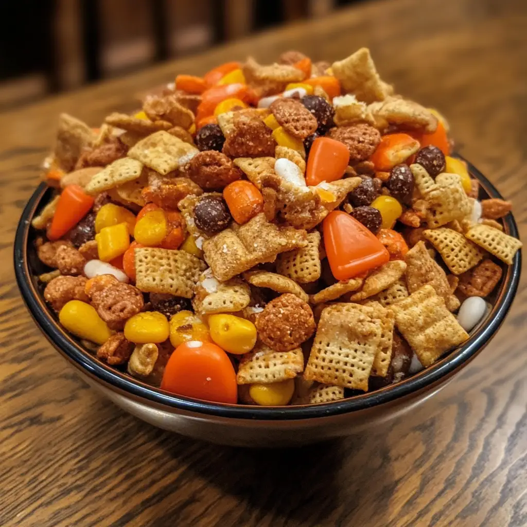 A fun and festive snack mix perfect for Halloween parties, combining sweet and salty flavors with a spooky twist.