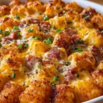 A comforting dish featuring crispy tater tots, creamy ham, and melted cheese, perfect for family dinners or potlucks.