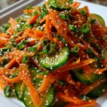 A vibrant salad featuring julienned carrots and cucumbers tossed in a flavorful sesame dressing, perfect for summer gatherings.