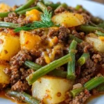 A comforting and nostalgic casserole dish combining ground beef, potatoes, green beans, and cheese, perfect for family dinners and gatherings.