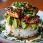 But it doesn’t stop there. As you bring this incredible chicken dish to your plate, you can’t help but notice the vibrant colors and textures coming together in perfect harmony. The gentle crunch of diced avocado adds a refreshing burst within the rich creaminess of sour cream, creating a delightful balance of flavors. Each layer plays its part, creating an orchestra of taste that invites you to dig in with enthusiasm. This honey lime chicken and avocado rice stack is not just a meal; it’s an invitation to savor every delicious moment.