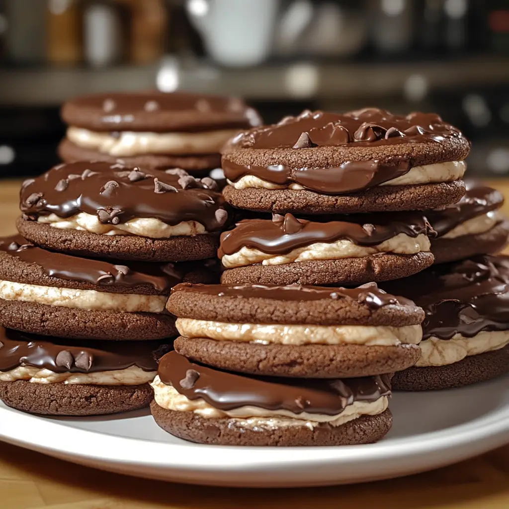 Delicious chocolate cookie sandwiches filled with creamy Kinder Bueno filling, perfect for dessert lovers.