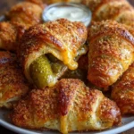 A delightful snack of dill pickles wrapped in flaky crescent roll dough, perfect for gatherings or cozy nights in.