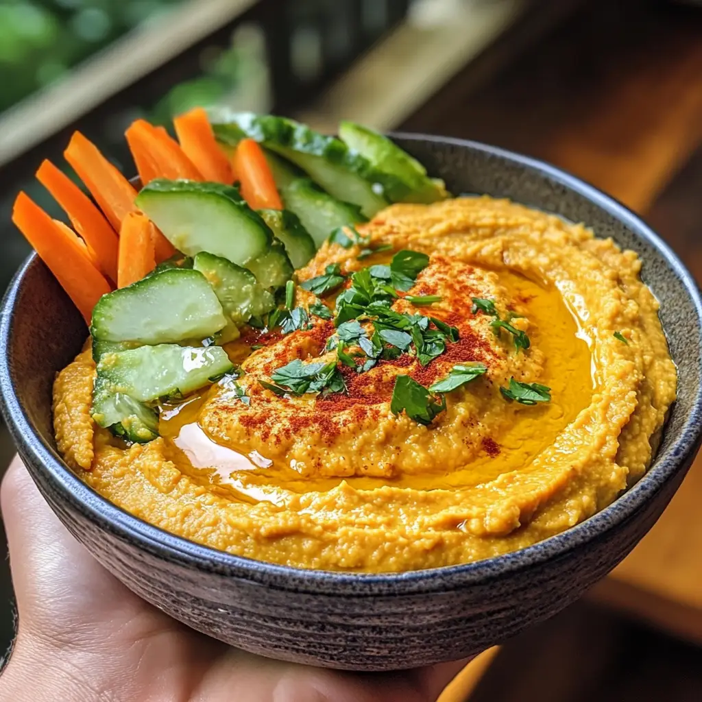 A delicious and nutritious pumpkin hummus served with fresh veggies, perfect for a healthy snack or appetizer.