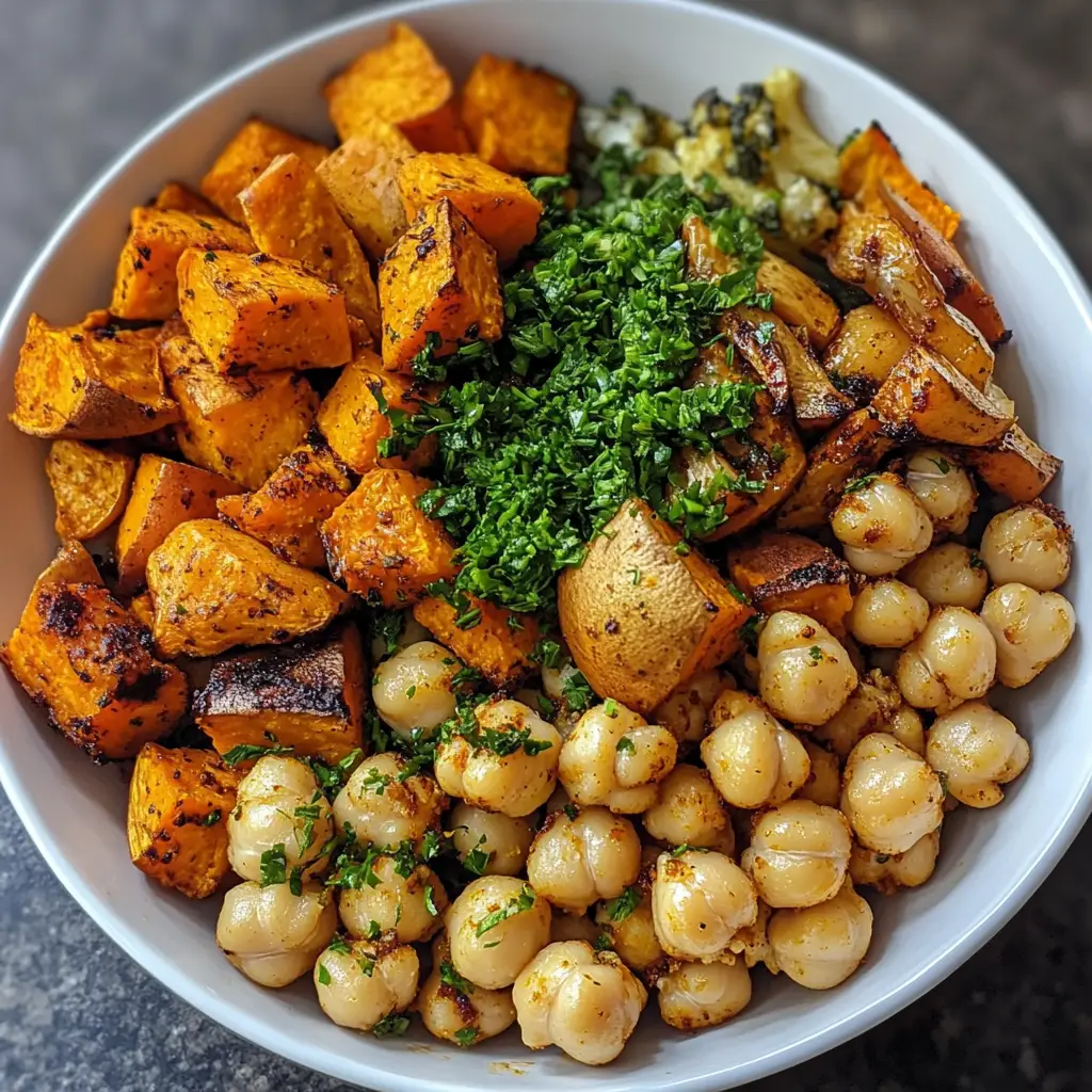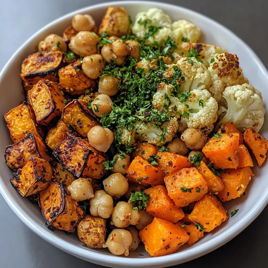 A delicious and nutritious bowl featuring roasted cauliflower, sweet potatoes, and chickpeas, perfect for a healthy meal.