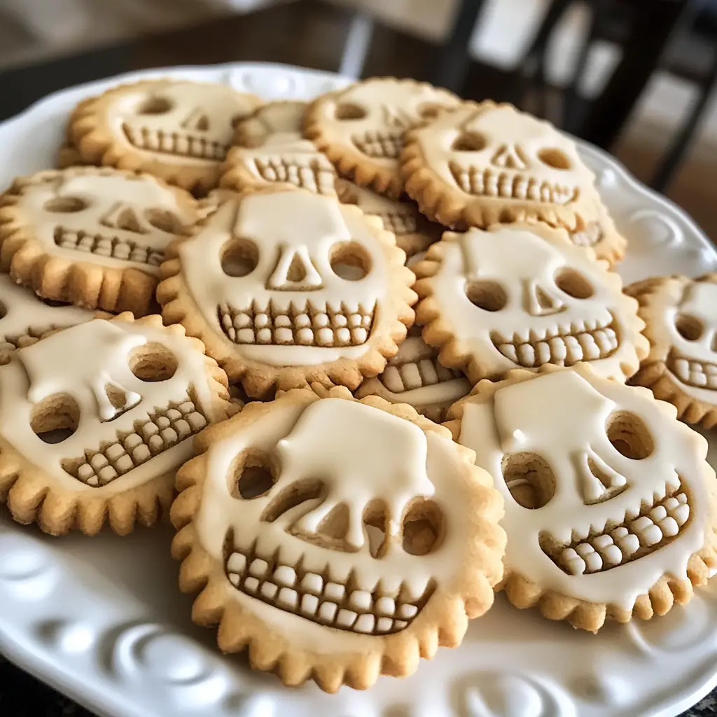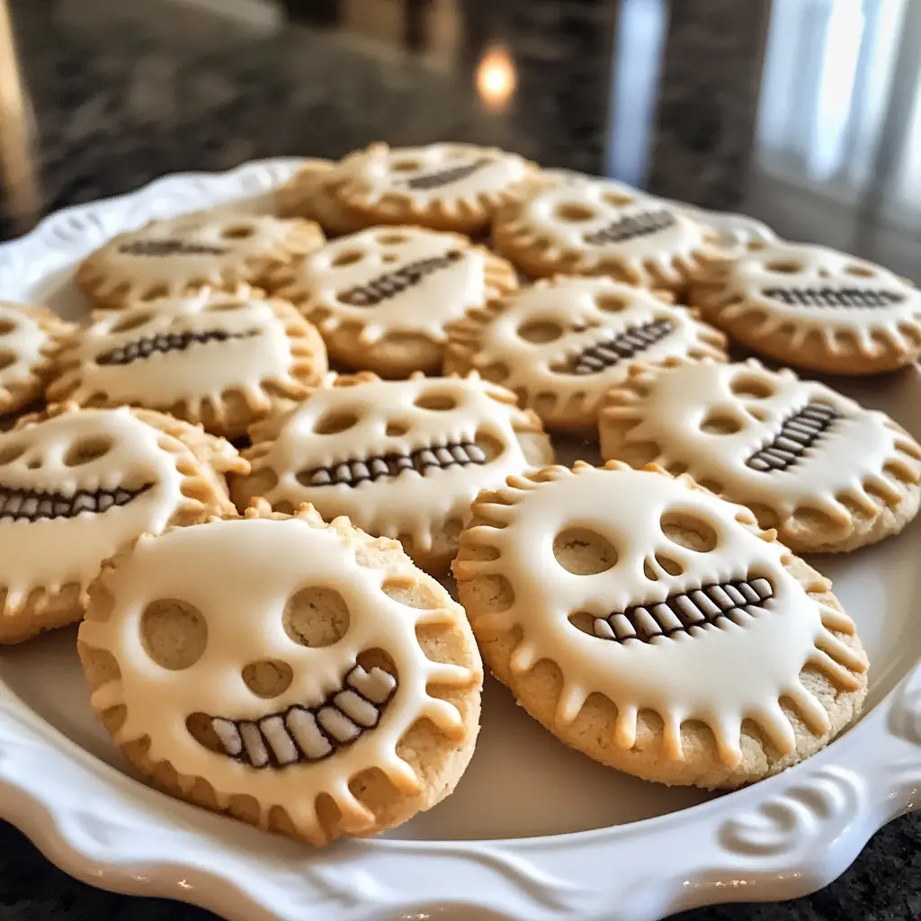 A delightful platter of skeleton-shaped sugar cookies, perfect for Halloween celebrations.