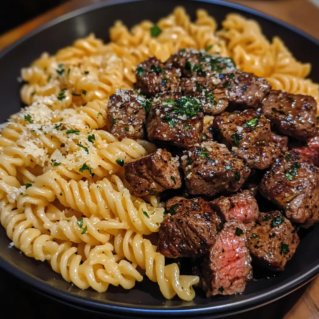 A delicious dish featuring tender steak bites served with cheesy rotini pasta in a rich garlic parmesan sauce.