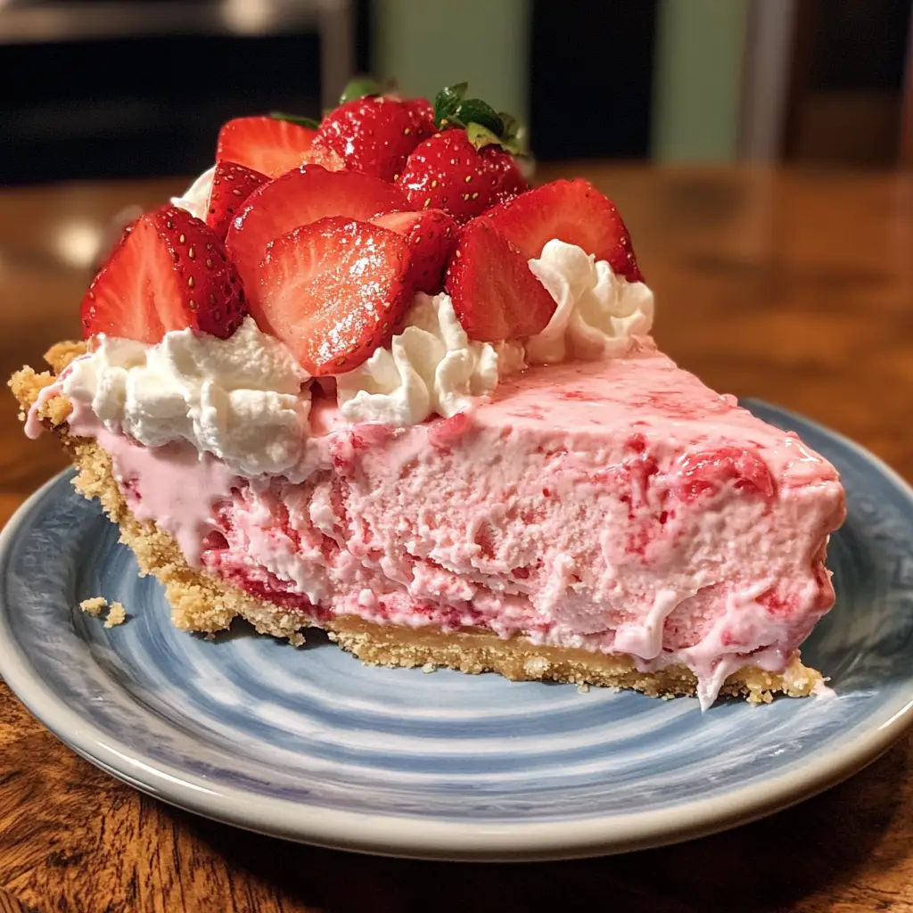 When you’re ready to serve, take the pie out of the freezer. Add a generous dollop of whipped cream on top and garnish with fresh strawberries. This not only makes it look stunning but also adds a burst of freshness with every bite!