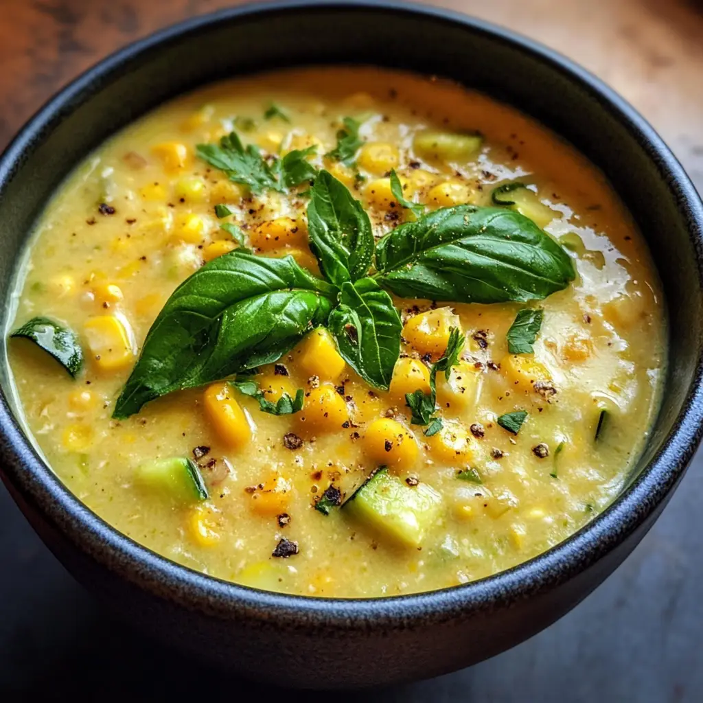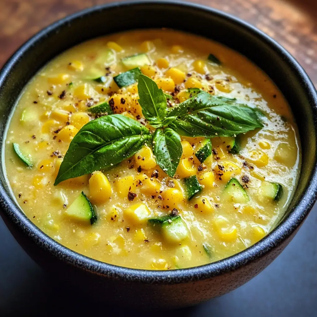 A refreshing and creamy chowder made with fresh summer corn and zucchini, perfect for warm weather.