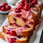 The vibrant red cherries bring both taste and color, inviting everyone to dig in. Imagine a bite: the soft, tender crumb yielding effortlessly, releasing bursts of cherry flavor, both sweet and slightly tart, mingling with warm undertones of almond and vanilla. You can’t help but smile as you taste the layers of flavor, and the soft, pillowy texture pairs perfectly with the smooth, sweet glaze that drizzles over the top. Each slice becomes a moment of joy, celebrating the beloved combination of fruit and bread that feels both elegant and homely.