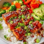 Assemble your bowls: Place jasmine rice in serving bowls, top with the glazed salmon and stir-fried vegetables, and garnish with green onions and sesame seeds. This vibrant presentation makes it impossible to resist.