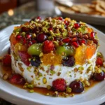 A delightful and refreshing fruit salad featuring a mix of fruits and a creamy pistachio dressing, perfect for any occasion.