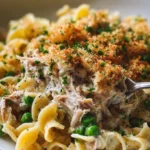 Imagine the moment as you scoop a generous portion onto your plate. The creamy sauce envelops the tender egg noodles, each twirling strand ready to deliver a mouthful of flaky tuna nestled amongst sweet green peas. The comforting aroma envelopes you, while the crunchy breadcrumb topping provides a delightful contrast, adding that extra layer of texture. It’s more than just a meal; it’s an experience that wraps you in warmth and joy, perfect for hectic weeknights or laid-back family dinners.